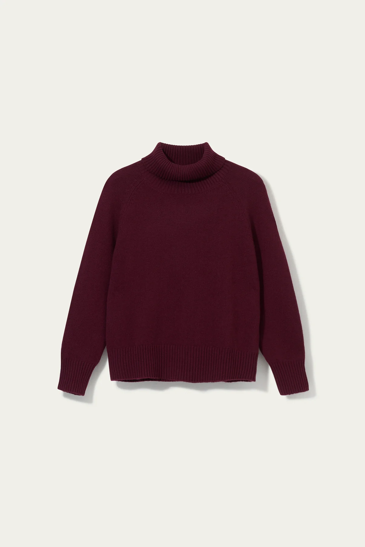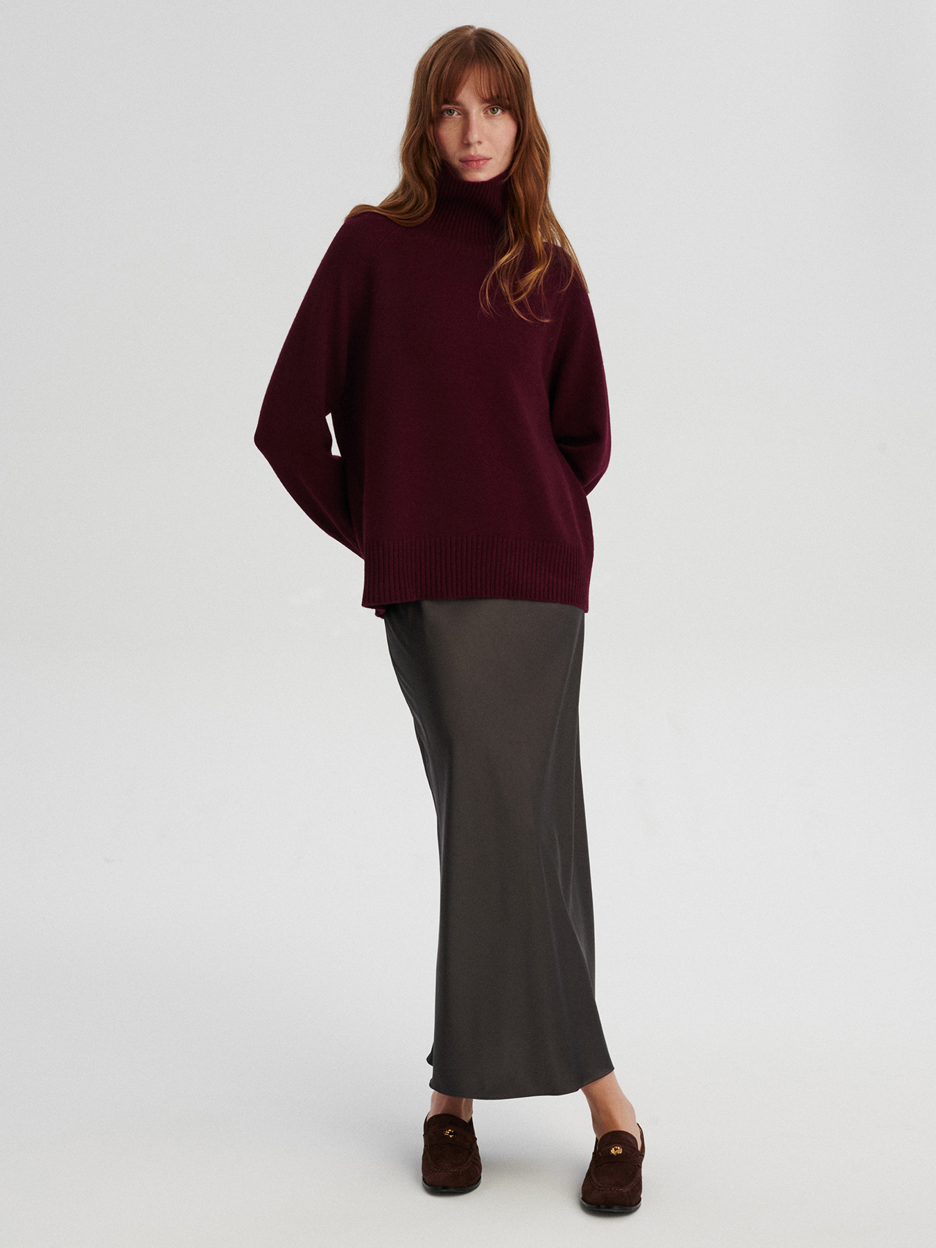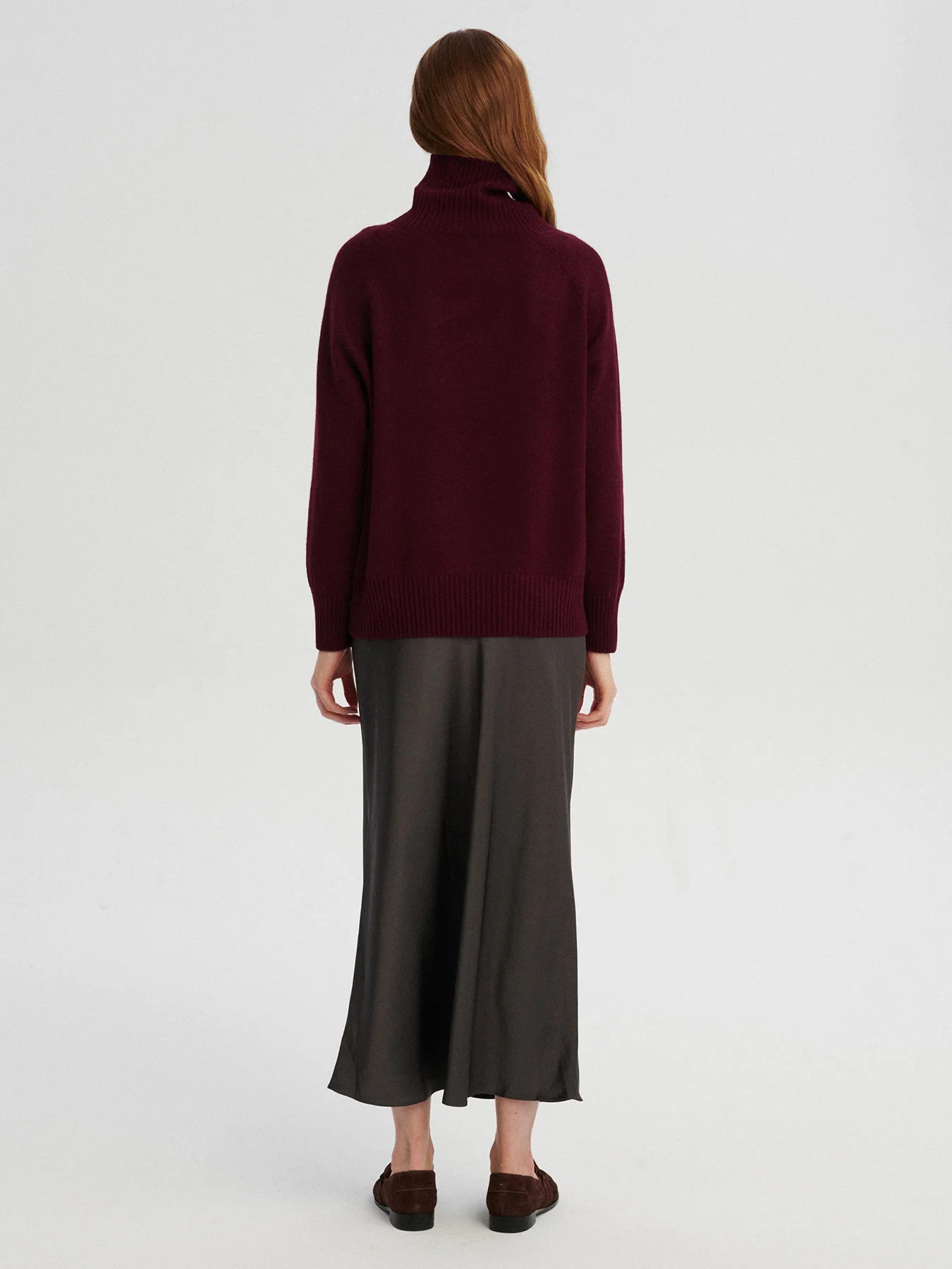 Pudełkowy sweter z golfem, wykończony szerokimi ściągaczami. Wykonany z czystego, mongolskiego kaszmiru. Wyjątkowo miękki i ciepły, grzeje, kiedy Ci chłodno i odprowadza ciepło i wilgoć, kiedy robi się cieplej. Raglanowy rękaw i luźny krój golfu tego swetra sprawiają, że wygląda bardzo stylowo. Jest doskonałą bazą jesienno-zimowej szafy kapsułowej. To jeden z tych modeli, dzięki którym nie powiesz już „nie mam co na siebie włożyć”.
