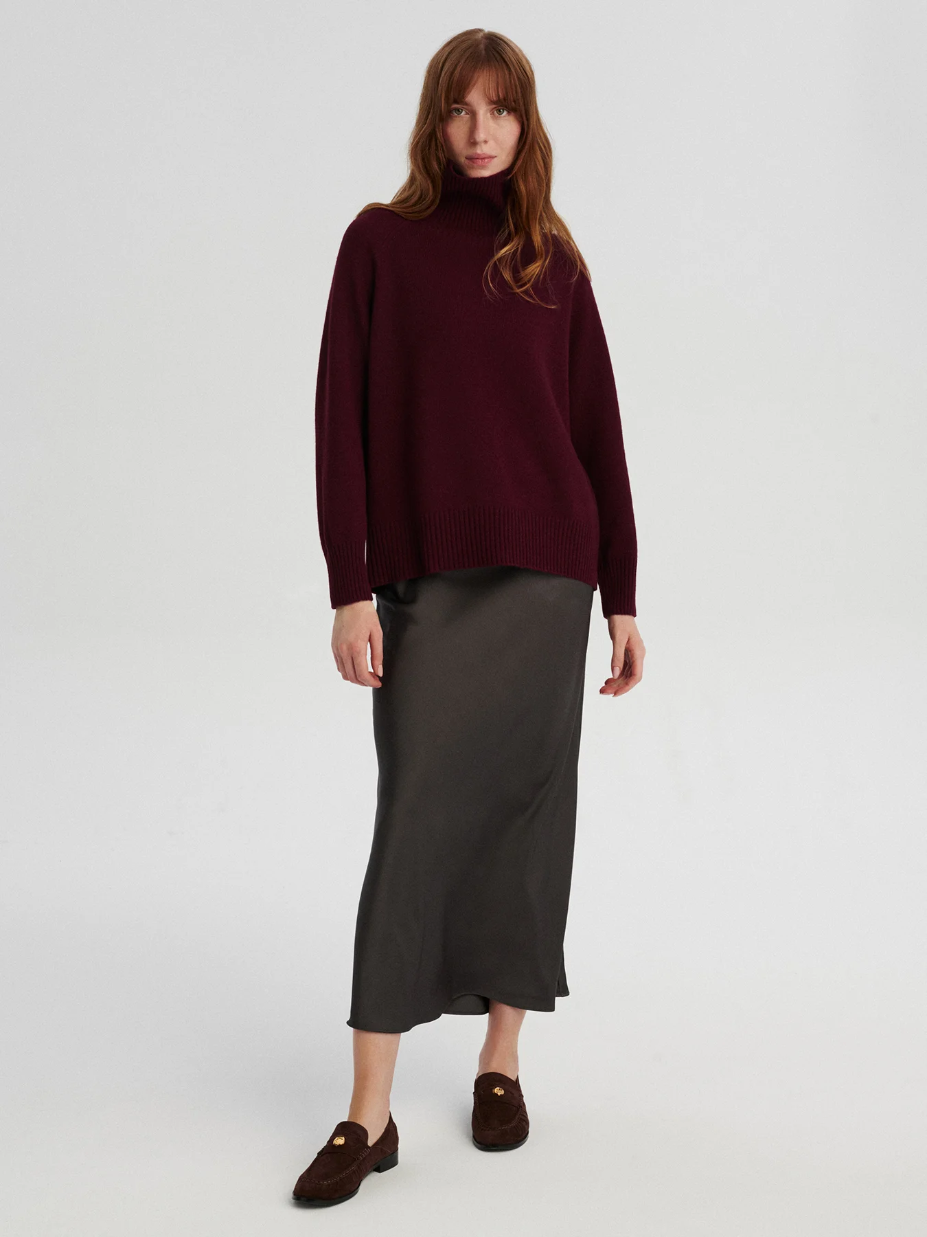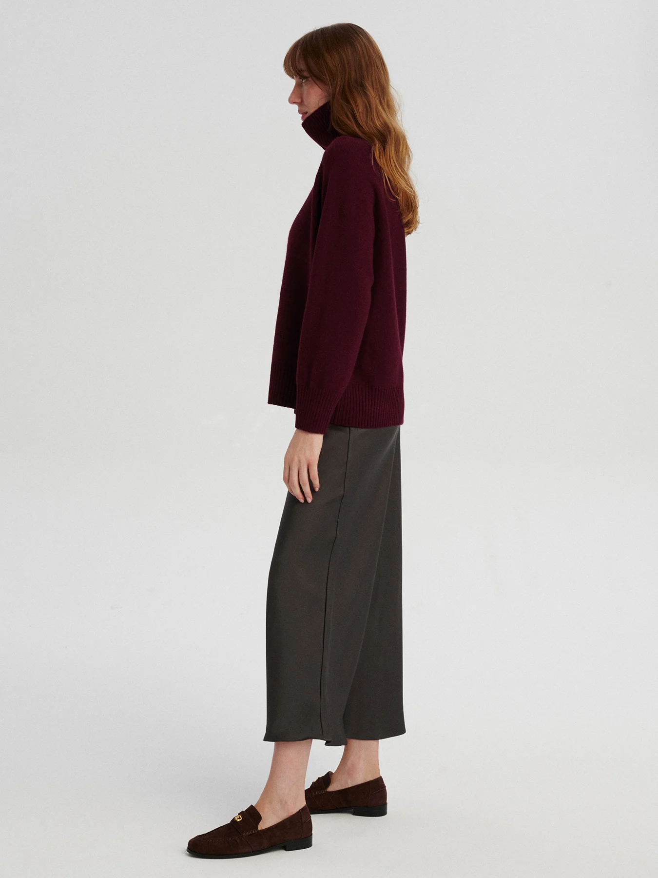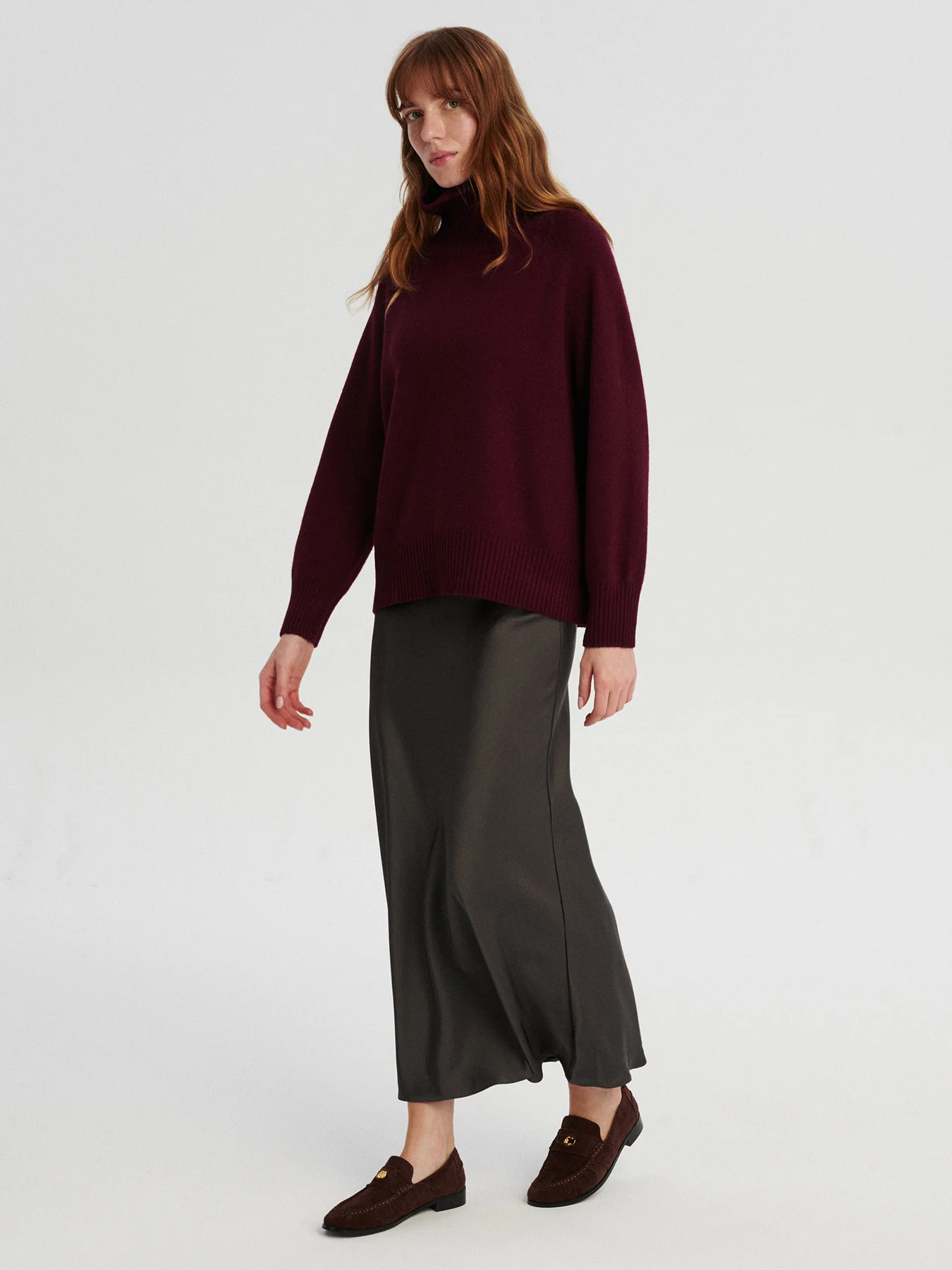 Pudełkowy sweter z golfem, wykończony szerokimi ściągaczami. Wykonany z czystego, mongolskiego kaszmiru. Wyjątkowo miękki i ciepły, grzeje, kiedy Ci chłodno i odprowadza ciepło i wilgoć, kiedy robi się cieplej. Raglanowy rękaw i luźny krój golfu tego swetra sprawiają, że wygląda bardzo stylowo. Jest doskonałą bazą jesienno-zimowej szafy kapsułowej. To jeden z tych modeli, dzięki którym nie powiesz już „nie mam co na siebie włożyć”.