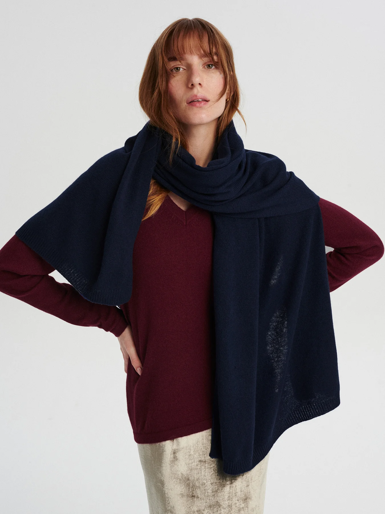 Dzianinowy szal ze 100% kaszmiru, stworzony w Mongolii. Niezwykle miękki, puszysty i delikatny w dotyku. Plastyczność szala daje mnóstwo możliwości jego układania i noszenie go na wiele sposobów – czy ciasno owinięty wokół szyi czy luźno zarzucony na ramiona, zawsze będzie wyglądać niezwykle stylowo. Idealnie sprawdzi się w okresie jesienno-zimowo-wiosennym.